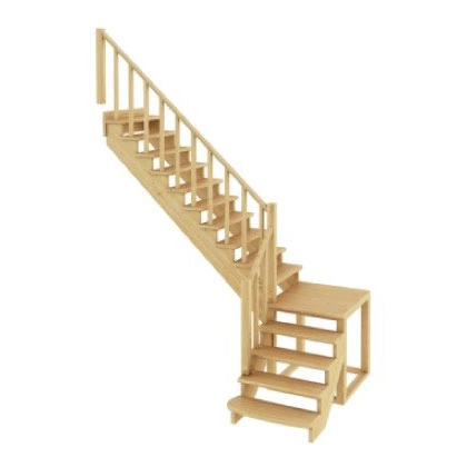 Ступени и поручень лестницы выполнены из бука, остальные элементы из сосны. Возможно изготовление данной модели полностью из бука. Базовый комплект включает в себя деревянные элементы лестницы и ограждения без какого-либо покрытия.