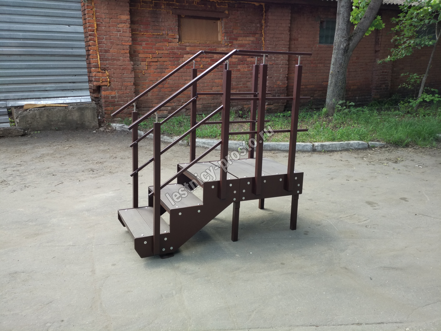 Ступени лестницы состоят из металлической рамки, обеспечивающей необходимую прочность, и покрытия из террасной доски ДПК (древесно-полимерный композит). Ступени не боятся воды и мороза, не теряют со временем свой внешний вид и не требуют ухода.