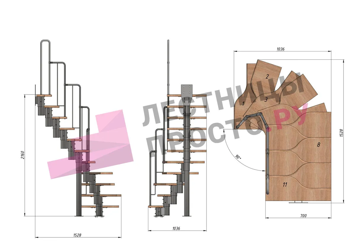 Лестница Prosto Urban Black гусиный шаг 700 мм, h198-288 см (11 ступеней), дуб