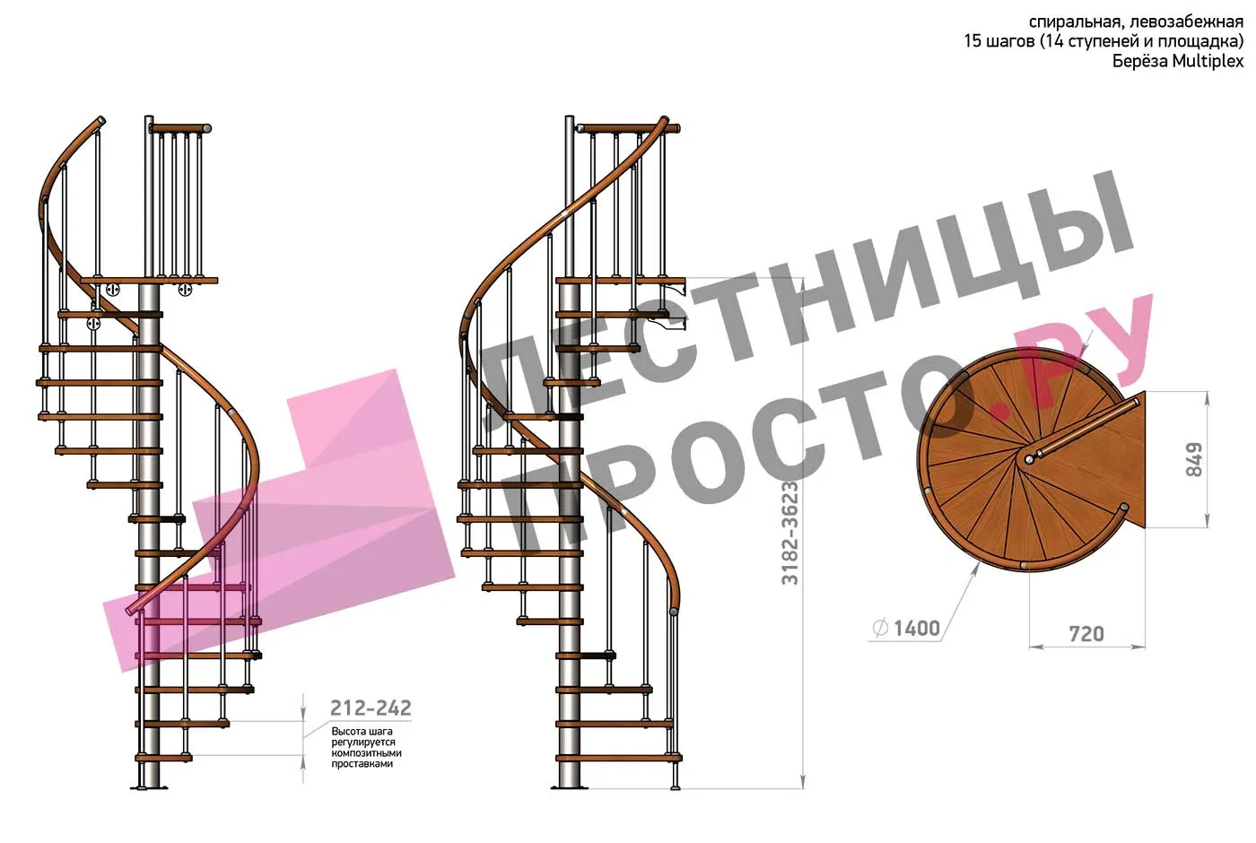 Высота лестницы 3182 - 3623 (14 ступеней) мм