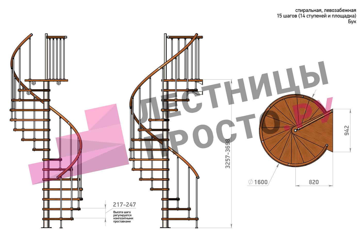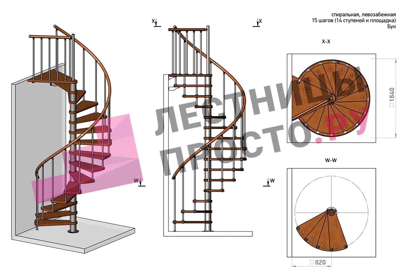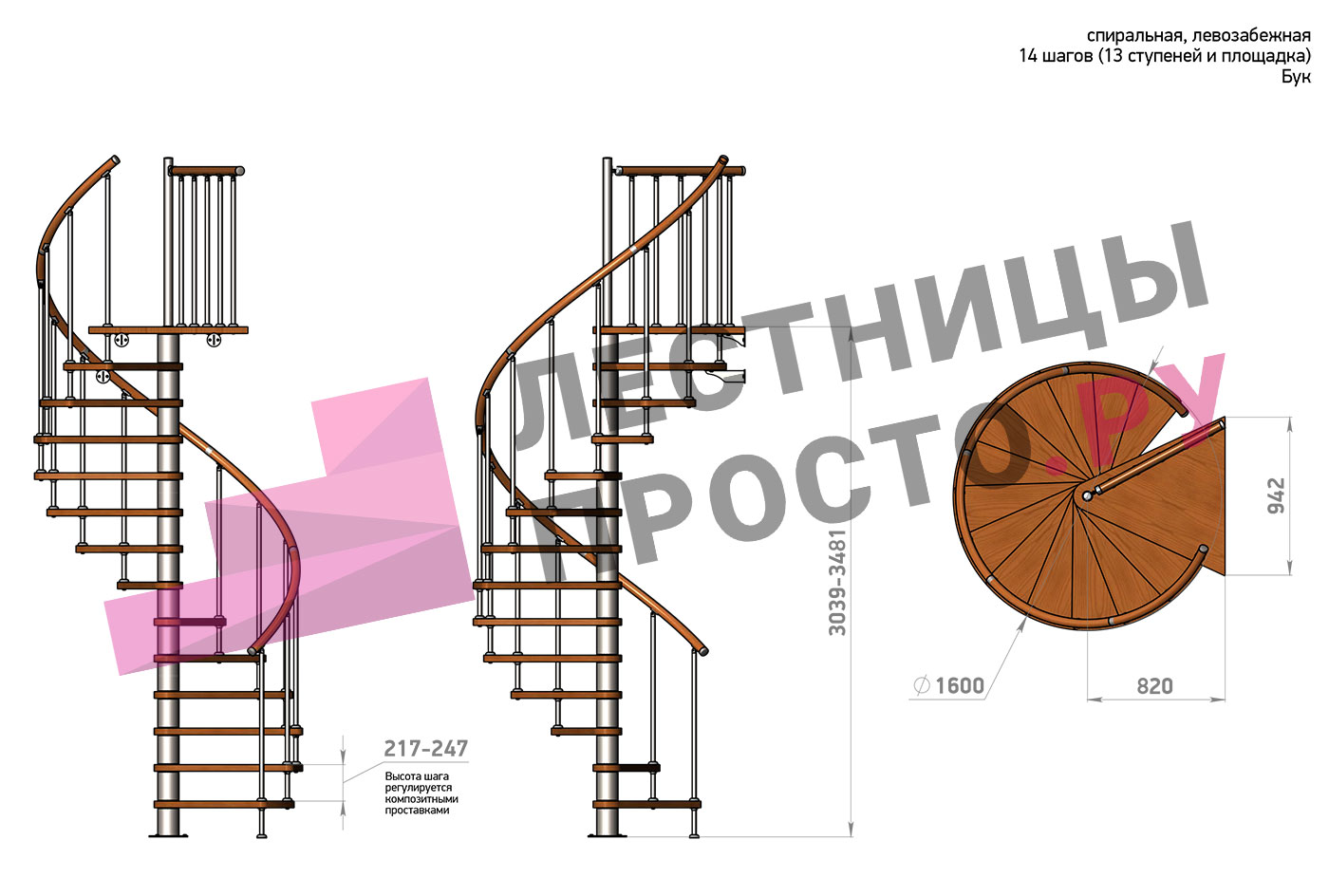 Левая, d=160см, 14 ступеней + площадка