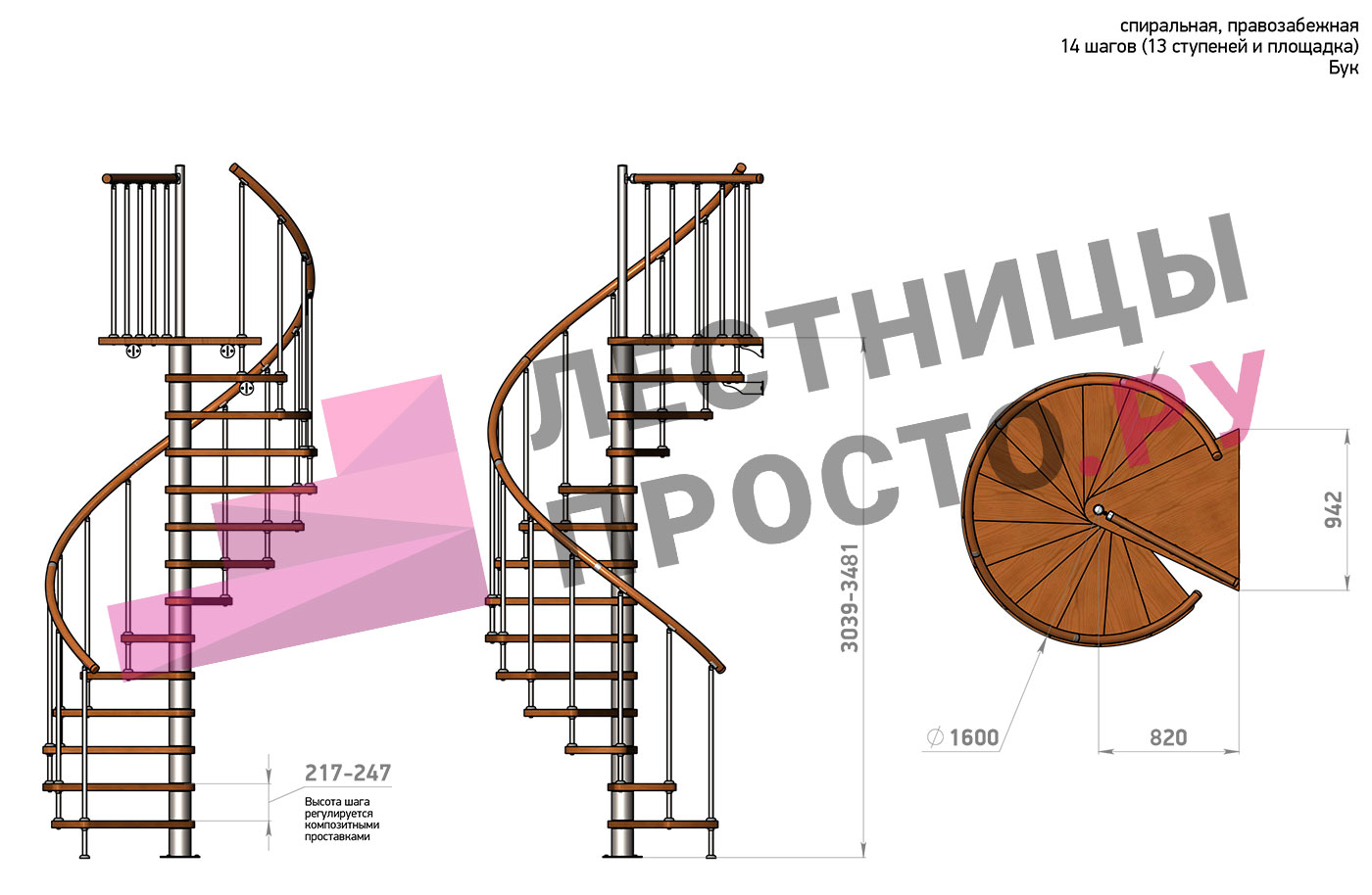 Правая, d=120см, 14 ступеней + площадка