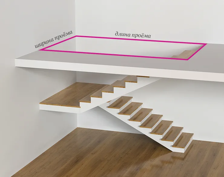Проём в межэтажном перекрытии отверстие в перекрытии, необходимое для монтажа лестницы. Размеры проёма рассчитывают с учётом высота прохода по лестнице, которая должна быть не менее 200 см.